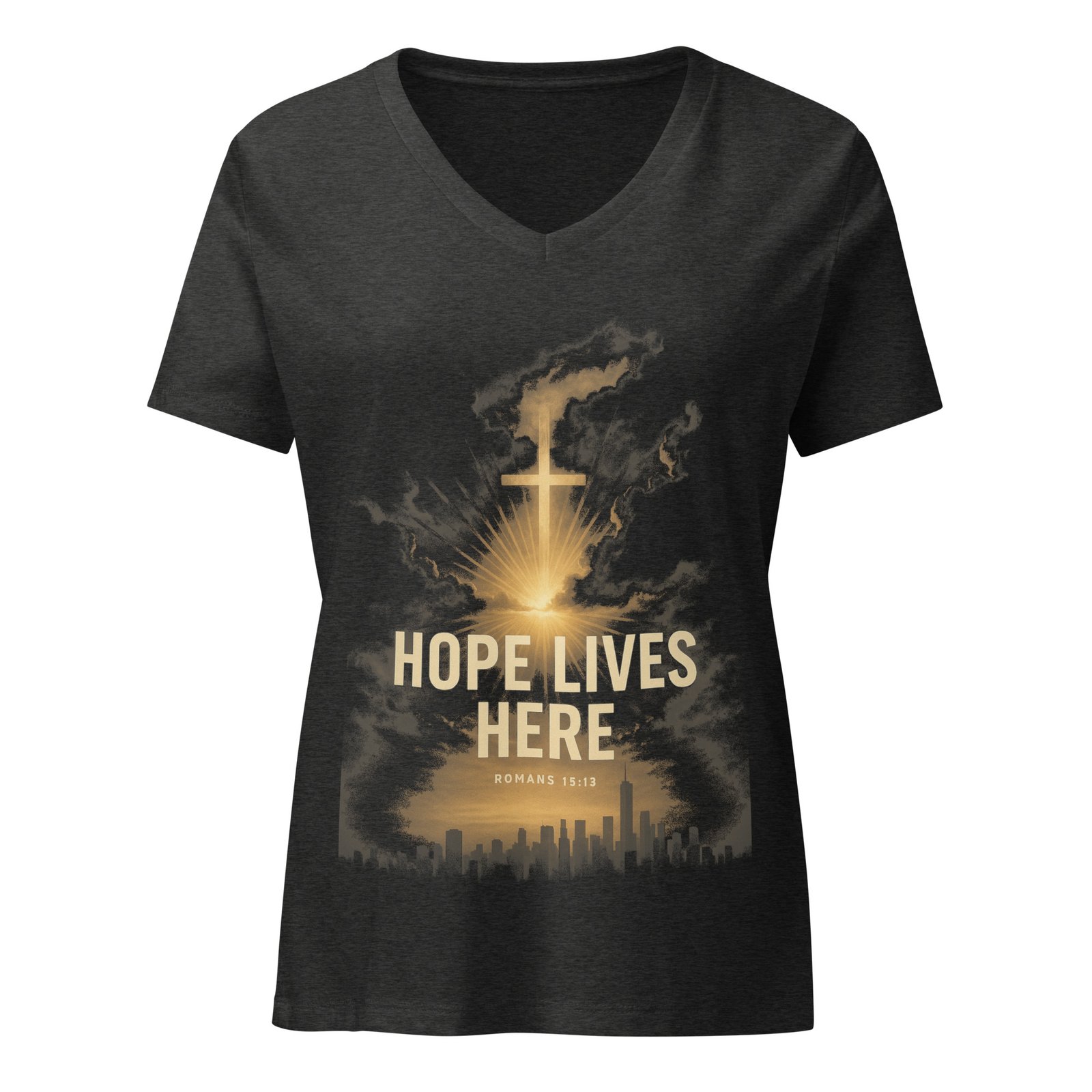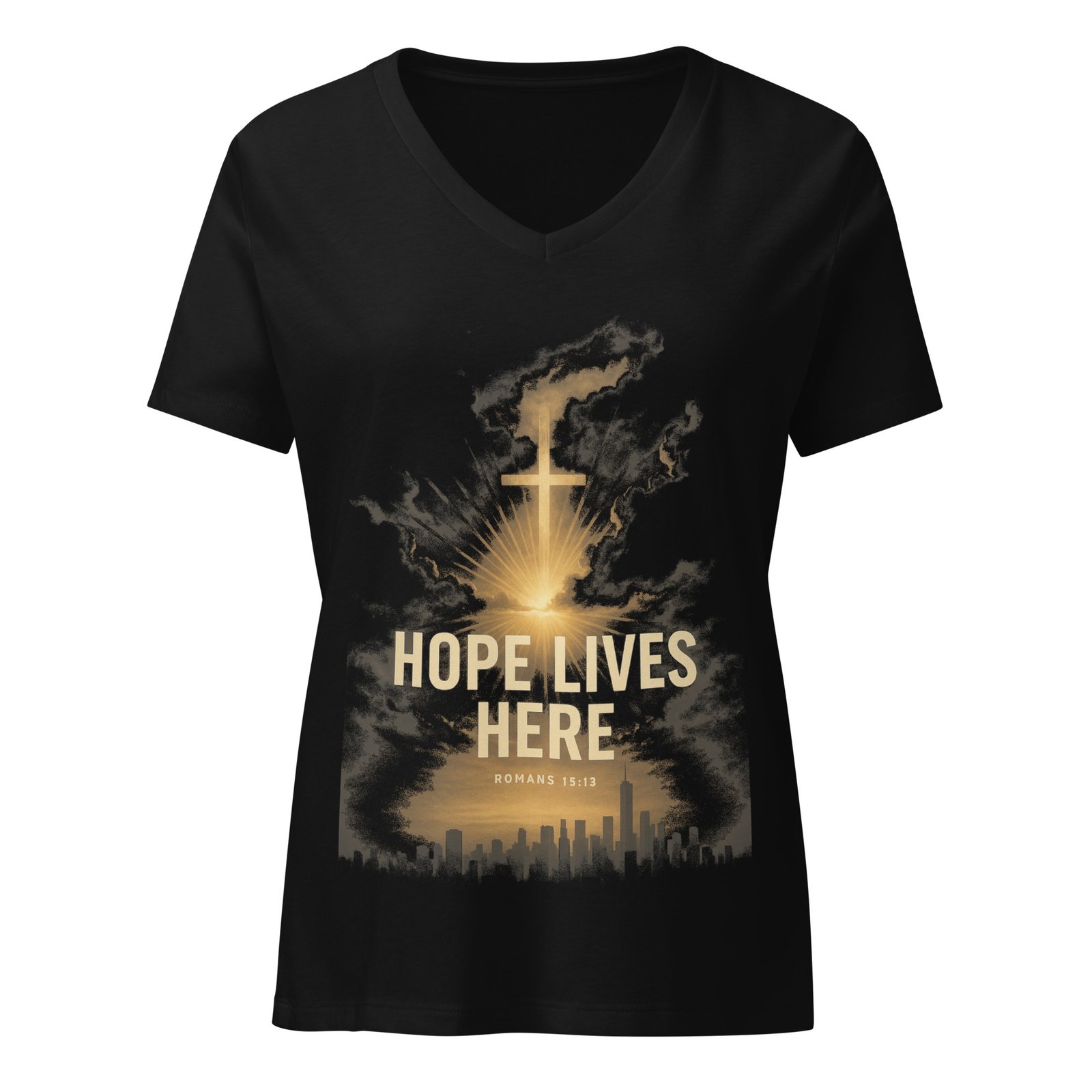 Be the first to review “Hope Lives Here Women’s Relaxed V-Neck T-Shirt (Double Print) | RockATeeWear”